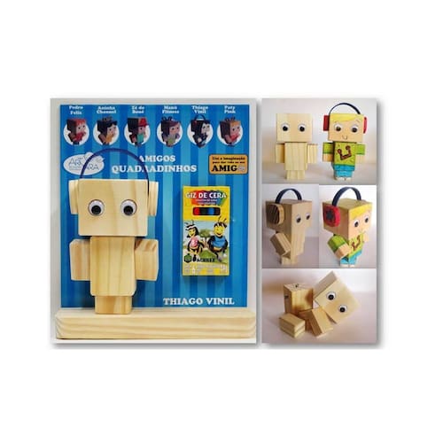 Amigos Quadradinhos Pinta Madeira Thiago Vinil - Artyara faz parte da coleção Pop! Bloc, da Artyara. É um boneco em madeira articulado, com 5 peças que se encaixam por botões de pressão em suas junções. Assim, a criança pode montar e desmontar quantas vezes quiser! Mas não é só isso: as peças são feitas em madeira crua, e podem ser pintadas de acordo com a imaginação, com os gizes de cera que acompanham o boneco, ou com guache, lápis de cor, o que a criança escolher! O Thiago Vinil vem com olhinhos que se mexem e fones de ouvido divertidos. Ótimo brinquedo para estimular a concentração e criatividade da criança.