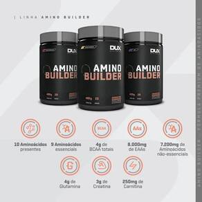 Amino Builder aminoácidos creatina dux nutrition 400g Sabor: Uva AMINO BUILDER É a fórmula premium de aminoácidos, os ingredientes-chave na nutrição esportiva. Desenvolvida especialmente para quem busca mais de seus treinos e atividades esportivas, ela complementa e potencializa a nutrição pré, intra, pós-treino e nos intervalos entre os treinos. O próximo nível de performance começa aqui.