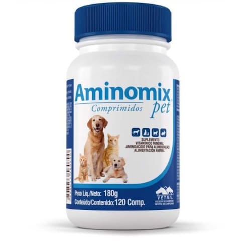 Aminomix pet comprimidos palatáveis fornece de forma prática as doses diárias de vitaminas, minerais e aminoácidos. A apresentação em forma de comprimidos facilita a dosificação e aceitação pelo animal. Indicação do produto Suplementação de aminoácidos, vitaminas, macro e microelementos para caninos, felinos, mustelídeos e roedores. Auxiliar na melhora da qualidade nutricional dos animais, importante na suplementação nas fases críticas da criação crescimento, desenvolvimento, gestação, lactação e geriatria .