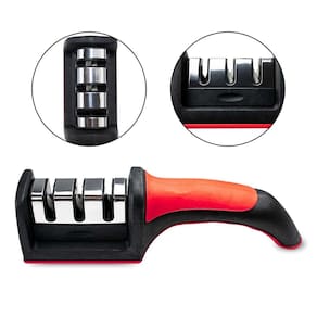 Modo de Uso: Coloque o amolador em uma superfície plana, com uma mão segure a alça do amolador, com a outra mão segure o objeto a ser afiado verticalmente na ranhura em V, com a força apropriada para puxar para trás (Não empurrar para frente) por várias vezes até afiar o item.