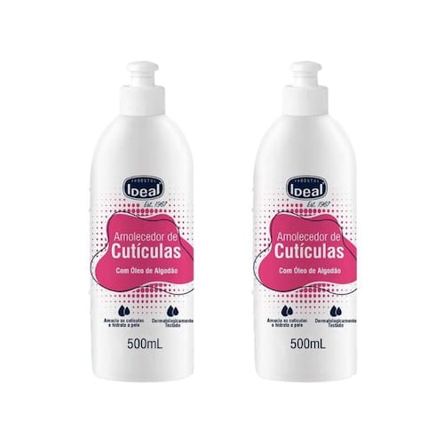 Amolecedor de cutículas ideal 500ml com óleo de algodão - kit com 2 unidades Descrição O amolecedor de cutículas ideal 500ml com óleo de algodão foi desenvolvido para facilitar a remoção de cutículas de forma suave e eficaz. Enriquecido com óleo de algodão, conhecido por suas propriedades emolientes e hidratantes, este produto ajuda a amolecer as cutículas rapidamente, tornando o processo de manicure mais fácil e confortável. Além disso, seu uso regular contribui para a hidratação e nutrição da pele ao redor das unhas, mantendo-as com aparência saudável e bem cuidada. Modo de uso Aplique uma pequena quantidade do amolecedor de cutículas ideal diretamente sobre as cutículas. Deixe agir por alguns minutos para que o produto possa amolecer as cutículas, facilitando a sua remoção. Empurre e remova as cutículas com o auxílio de um palito ou espátula, conforme preferir. Lave bem as mãos após o uso para retirar qualquer resíduo. Utilize sempre que for fazer a manicure para manter as cutículas macias e bem tratadas. Marca: Não Informado Ean: 7908945239413