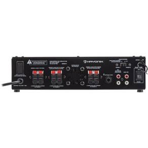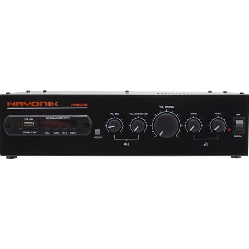 DESCRIÇÃO Modelo:versátil PRO-620 Marca:hayonik O VERSÁTIL PRO-620 é a solução para a amplificação para seu sistema de som ambiente Utilizado para sonorizar diversos ambientes tais como estabelecimentos comerciais, escritórios, clínicas e até mesmo em casa ou em áreas de lazer. Possui Bluetooth integrado para facilitar a transmissão de músicas direto de seu Smartphone. Além disso, possui ainda entrada para dispositivos USB e SD na parte frontal e entrada P10 para microfones e RCA na parte traseira do produto. Em seu controle, possui o botão EQ que permite escolher entre as equalizações Grave, Pop, Jazz, Clássica e Country. CARACTERÍSTICAS Classe:ab Canais:1 Canal com saída para 4 Ohms 2 caixas de 8 Ohms em paralelo ; 1 Canal com saída 0,8 Ohms para até 10 caixas de 8 Ohms ligadas em paralelo; 1 Canal 70V. Potência:100w RMS Impedância:0,8 Ohms, 4 Ohms ou 70V Entradas:entrada USB; Entrada para cartão SD; Entrada para microfone P10 ; Entrada auxiliar RCA . Saídas:borne Dimensões:axlxp: 80 x 210 x 300 mm THD:0,01% Sensibilidade:microfone/guitar: 15mV Auxiliar: 250mV Equalização:knob de equalização Grave e Agudo; Equalizações presets: Grave, Pop, Jazz, Clássica e Country Alimentação:127 ou 220 ~VAC / Seleção Automática Peso:3,5kg Consumo de Energia:120VA Máximo Homologação Anatel: 060792000160 Ean: 7899638105460