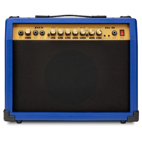 LyxPro Amplificador de guitarra elétrica de 40 watts | Combo amplificador de estúdio de estado sólido com alto-falante de 20 cm de 4 Ohm, controles de equalização personalizados, drive, atraso, - Som enorme para cada configuração | Poderoso amplificador combo de 40 W transforma sua guitarra elétrica como nunca antes com equalização personalizada, entradas passivas/ativas, acionamento ajustável, atraso digital e várias opções de saída para apresentação de palco, gravação de estúdio, shows ao ar livre, prática em casa e outras aplicações musicais - Alto-falante EXPLOSIVO de 20 cm e 40 WATT | Impedância de 4 Ohm proporciona agudos claros, graves estrondosos, excelente resistência à corrente e resposta de frequência confiável para todos os tipos de instrumentos exigentes | O controle de volume mestre permite ampla funcionalidade, desde reprodução solo íntima até saída de show ao vivo trovejante - Equalização perfeita | As configurações integradas do equalizador ajudam você a alcançar diversas tonalidades para todos os estilos de jogo, incluindo boost (liga/desliga), distorção variável (ganho), atraso digital (tempo/repetição) e ajuste de agudos, médios e graves (0 a 10) | Gire os botões para um som de guitarra limpo e claro ou reprodução corajosa e soprada em overdrive - 3 experiências de audição exclusivas | além do alto-falante embutido do amplificador, desfrute de uma variedade de opções de saída para se adequar à sua configuração exata, incluindo um conector de fone de ouvido de ¼ polegadas para audição privada e porta de saída de linha para conectar alto-falantes externos maiores, sistemas de PA, consoles de mixagem e outros equipamentos de gravação | Cabo de alimentação incluído - Leve o show na estrada | O amplificador de guitarra altamente capaz é super durável e portátil, medindo 43 x 21,6 x 34 cm e pesando apenas 11,5 kg. Para facilitar a viagem | possui uma entrada de microfone integrada de ¼" e volume de microfone ajustável para que cantores e músicos possam se conectar — ótimo para shows ao vivo, apresentações de rua e muito mais