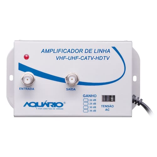 O AL-25 da Aquário é um Amplificador de Linha com 25Db de ganho para intensificar e estabilizar o sinal de TV VHF, UHF, CATV e HFTV em instalações coletivas ou situações em que o sinal se perde com tantos cabos. Esse equipamento é ideal para quem precisa colocar vários pontos de TV e com isso precisa usar divisores de linha. O AL-25 ajuda a equilibrar e manter estável o sinal digital de TV, não permitindo que ele fique perdido nos longos cabos e divisores. // Alta Durabilidade O AL-20 conta com um case de metal coberto por uma pintura eletrotática para proteção do equipamento, aumentando muito a sua resistência, durabilidade e também ajuda a diminuir interferências. // Baixo Consumo O amplificador de sinal possui um baixo consumo de energia e ainda conta com uma chave seletora para escolher entre 110v ou 220v. // Especificações Técnicas - Código do Produto: AL-25 - Faixa de Frequência: 54 - 806 MHz - Impedância: 75 Ohms - Ganho: 20Db - Led: Power On Power Off - Case: Metálico - Conector: F Fêmea - Material: Metal - Peso: 310g Homologação Anatel: 031711910604 Ean: 7898127605917