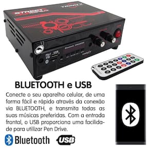 - Conectividade Avançada: Equipado com diversas opções de entrada, como Bluetooth, USB e AUX, o amplificador oferece flexibilidade para reproduzir conteúdo de uma variedade de dispositivos, como smartphones, tablets, pendrives, etc.