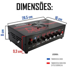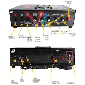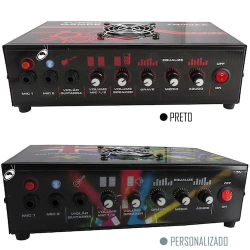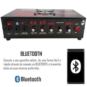 ESPECIFICAÇÕES TÉCNICAS:- 02 Vias de saída de áudio - 4 Ohms (Impedância mínima);- Disponível em duas cores: PRETO ou PERSONALIZADO;- Conexão via Bluetooth;- Entradas para Mic/Microfone, Ajuste de nível/volume dos Microfones;- Equalizador Grave - Médio - Agudo;- Entrada para Violão Elétrico / Guitarra;- Ajuste de nível/ volume / da saída para os alto falantes;- Entrada RCA;- Alimentação 110 ou 220V A/C (chave setetora);- Dimensões - Altura 9,3 cm / Largura 16 cm / Comprimento 28,5 cm