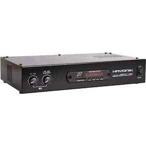 Amplificador hayonik compact 1000 80w rms com bluetooth O amplificador hayonik compact 1000 é um modelo versátil, prático e de fácil manuseio. Possui entrada usb, sd, aux rca, microfone, rádio fm e bluetooth. É leve, compacto e de fácil instalação. Além disso, ele é o modelo ideal para quem busca praticidade e qualidade por um baixo custo. Equalização:volume mic, volume aux Alimentação:bivolt Peso:1,76kg Consumo de energia:160va Classe:ab Canais:4 Potência:80w rms Impedância:4 ohms Entradas:p10 mono/rca Saídas:até 8 caixas de 8 ohms 2 por canal Dimensões:78 x 310 x 210mm Thd:0,05% Pesquisa:amplificadorhayonikamplificador compactpotencia Modos: usb, sd, bluetooth, fm Tensão de rede: 100 a 240vac 60hz Controle remoto: sim Sensibilidade: microfone/guitarra 15mv Auxiliar 250mv Conteúdo da embalagem: 01 amplificador compact 1000 01 manual do proprietário e o certificado de 01 controle remoto 01 bateria para controle remoto Homologação da anatel: 05 150 -18 - 11597 Homologação Anatel: 112572013224 Marca: Não Informado