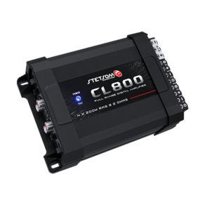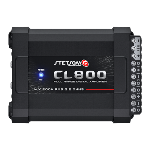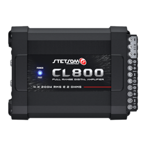 ESPECIFICAÇÕES TÉCNICAS CARACTERÍSTICAS CL800.4 Número de Canais 4 Potência RMS 400W Potência RMS em 2 Ohms 14,4V 4 x 200W Tensão de Alimentação 9V a 15V DC Resposta em Frequência 10Hz a 20KHz Crossover Low Pass 90Hz Crossover High Pass 90Hz Relação Sinal Ruído >90dB Sensibilidade de Entrada RCA: 230mV / HIGH: 1.5V Impedância de Entrada RCA: 23K Ohms / HIGH: 1K Ohm Impedância Mínima de Saída STEREO: 2 OHMS / BRIDGE: 4 OHMS Consumo com Sinal Musical 34A Consumo com Sinal Bass 68A Dimensões (A x L x C) mm 54 x 113 x 163 mm Peso Kg: 745g