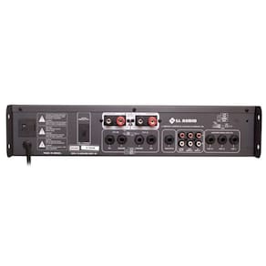 Amplificador para sonorização ambiente, podendo trabalhar em 4 ohms 300 + 300w rms ou 70 volts 300w rms . Gongo ding-dong c.V.I. Especificações técnicasEntradas: 2 microfones mic1 e mic2 com a função mic priority m.P. E c.V.I. 1 microfones mic3 p10 c.V.I. 2 entradas auxiliares in com conectores p10 canais l/r 2 entradas auxiliares a1 e a2 com conectores rca estéreo s.A E c.V.I. Saídas: 2 send com conector p10 1 remote aciona o gongo a distancia 1 auxiliar line out com 2 conectores rca mono 2 output a e output b com borne positivo e negativo e c.V.I. 1 saída 70v quando output a e output b são ligadas em bridge caixas com trafo de linha 70v respeitando potência máxima e perdas com cabos. Equalizador: 3 bandas - low, mid, high Consumo total à potência máxima: 840 w rms Proteção: alto-falantes / fusível / overload - sobrecarga e curto Alimentação:127/220v Dimensões mm : l 485 x h 90 x p 425 Peso kg : 7,8