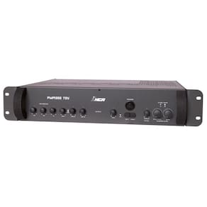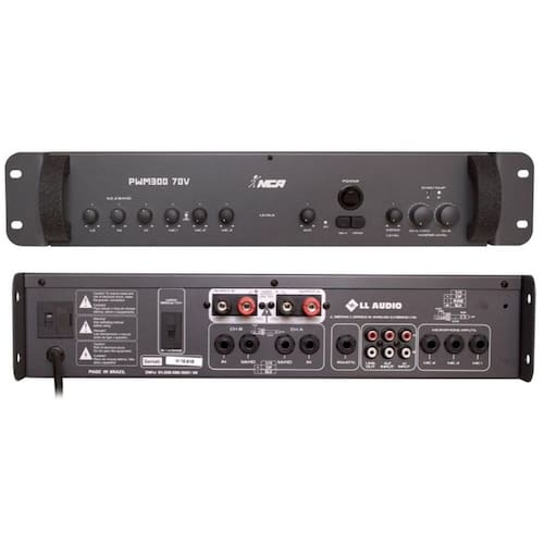 Amplificador para sonorização ambiente, podendo trabalhar em 4 ohms 300 + 300w rms ou 70 volts 300w rms . Gongo ding-dong c.V.I. Especificações técnicas Entradas: 2 microfones mic1 e mic2 com a função mic priority m.P. E c.V.I. 1 microfones mic3 p10 c.V.I. 2 entradas auxiliares in com conectores p10 canais l/r 2 entradas auxiliares a1 e a2 com conectores rca estéreo s.A E c.V.I. Saídas: 2 send com conector p10 1 remote aciona o gongo a distancia 1 auxiliar line out com 2 conectores rca mono 2 output a e output b com borne positivo e negativo e c.V.I. 1 saída 70v quando output a e output b são ligadas em bridge caixas com trafo de linha 70v respeitando potência máxima e perdas com cabos. Equalizador: 3 bandas - low, mid, high Consumo total à potência máxima: 840 w rms Proteção: alto-falantes / fusível / overload - sobrecarga e curto Alimentação:127/220v Dimensões mm : l 485 x h 90 x p 425 Peso kg : 7,8 Homologação Anatel: 170222003229 Ean: 7908481203152