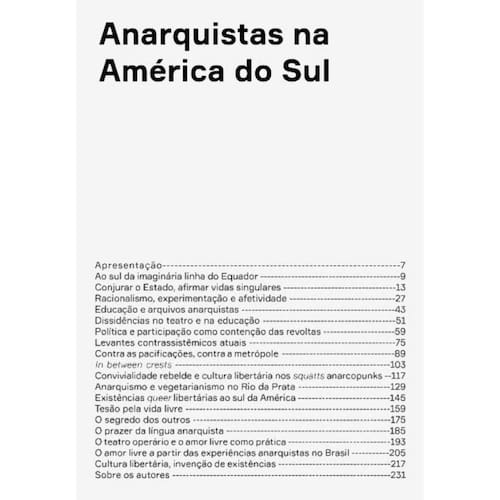 "Anarquistas na América do Sul" é uma antologia de 18 textos, escritos a partir do encontro de mesmo nome, resultado da livre associação de três núcleos de pesquisa: Nu-Sol (Núcleo de Sociabilidade Libertária da PUC-SP), LIMA (Laboratório Insurgente de Maquinarias Anarquistas) e LASInTec (Laboratório de Análise em Segurança Internacional e Tecnologias de Monitoramento, da UNIFESP). Durante quatro dias de mesas e rodas de conversa virtuais, pesquisadores anarquistas de língua portuguesa e espanhola discutiram e experimentaram lutas e práticas libertárias. O livro, que contém o registro escrito de muitos desses debates, foi organizado de forma aberta, de modo a inscrever em sua estrutura o espírito livre do encontro documento fundamental da pesquisa libertária nesta região do planeta. Ean: 9788577157297