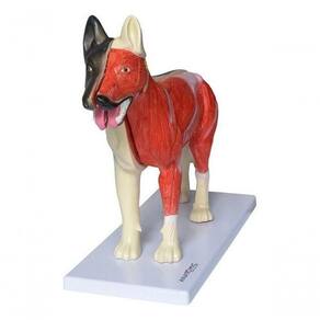 Modelo da anatomia do cachorro em 10 partes com musculatura. O modelo apresenta com riqueza de detalhes estruturas anatômicas da cabeça, tórax e abdômen, com órgão internos removíveis, evidenciando músculos e glândula parótida. Numerado em regiões especificas para estudo. Confeccionado em resina plástica de alta qualidade, montado sobre base.