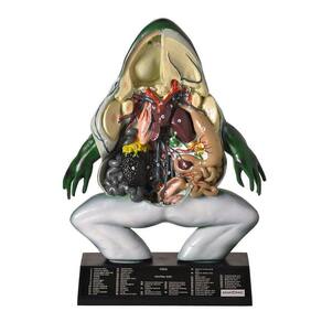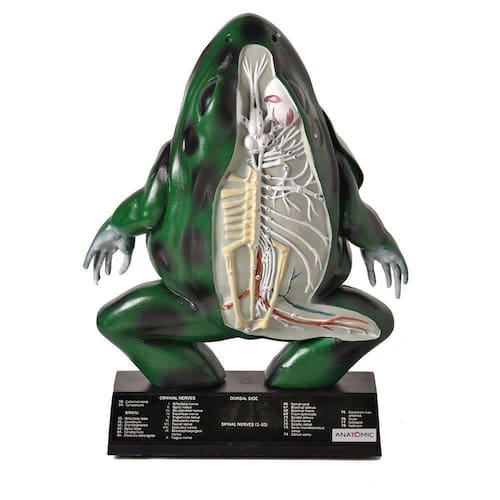 Modelo da anatomia do sapo em corte coronal, para visualização frontal dos órgãos internos, sistemas e aparelho reprodutor. Podendo visualizar no verso o esqueleto.