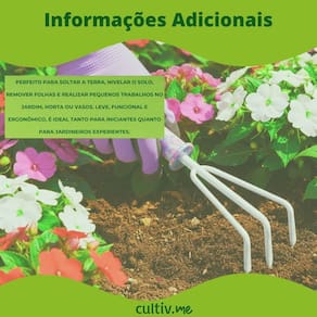 Características * Aço de alta qualidade: maior durabilidade e resistência ao uso diário. * Cabo decorado e ergonômico: confortável para segurar e com visual exclusivo. * Ferramenta leve e prática: ideal para tarefas rápidas e precisas na jardinagem. * Tamanho compacto: facilita o manuseio e o armazenamento. * Largura do Ancinho: 11 cm * Altura total: 23 cm * Material do cabo: Plástico estampado * Material do Ancinho: Aço * Indicação de uso: Jardinagem em geral (vasos, canteiros, hortas)