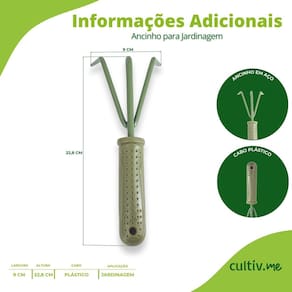 Características * Aço de alta qualidade: maior durabilidade e resistência ao uso diário. * Cabo ergonômico: confortável para segurar e com visual exclusivo. * Ferramenta leve e prática: ideal para tarefas rápidas e precisas na jardinagem. * Tamanho compacto: facilita o manuseio e o armazenamento. * Largura do Ancinho: 9 cm * Altura total: 22,8 cm * Material do cabo: Plástico estampado * Material do Ancinho: Aço * Indicação de uso: Jardinagem em geral (vasos, canteiros, hortas)