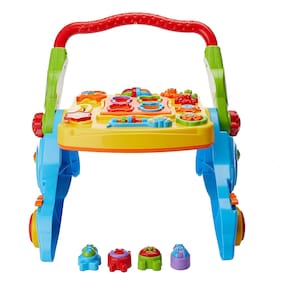 Atividades educativas inclusas no Andador: Tampa passa-cubos, com 4 animaizinhos; A estrela gira e desliza; A maçã é um relógio com ponteiros que giram; O cilindro é giratório; O sol tem melodia; 3 Engrenagens giratórias; O cachorro tem anéis coloridos e com texturas; O trevo gira e faz barulho.