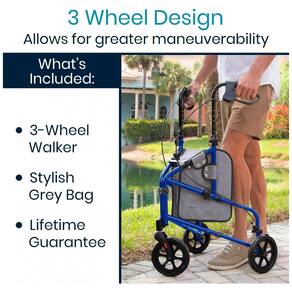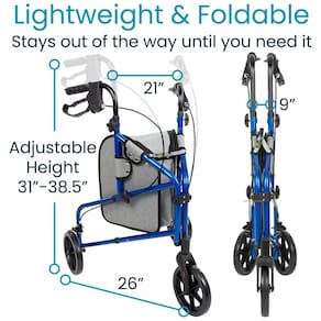 NAVEGUE FACILMENTE EM ESPAÇOS PEQUENOS Fornecendo suporte estável, o tri rollator é compacto e leve para uso em casa ou em trânsito. O andarilho de três rodas possui uma roda giratória frontal para maior capacidade de manobra em espaços apertados, áreas lotadas, corredores estreitos e muito mais. As rodas de são ideais para navegar em ambientes internos e externos em superfícies moderadamente lisas. DESIGN DOBRÁVEL Desmontando rapidamente para transporte em um veículo ou para zenamento conveniente, o tri rollator se dobra perfeitamente ao meio. O andarilho compacto também é independente quando dobrado para posicionamento ao lado de uma cadeira ou sofá. ESTRUTURA AJUSTÁVEL LEVE Construído com alumínio durável, o tri rollator Vive Mobility é excepcionalmente leve e suporta até 113 kg. Fácil de montar sem a necessidade de ferramentas, o guidão compacto do andarilho também é ajustável em altura para conforto pessoal. BOLSA DE ACESSÓRIOS A bolsa de acessórios incluída contém bebidas, lanches, copos e itens essenciais em uma bolsa segura. A elegante bolsa giratória cinza se encaixa facilmente na estrutura e é removível para limpeza e zenamento de longo prazo Marca: Não Informado