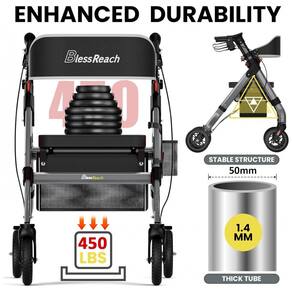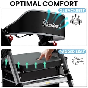 CAPACIDADE DE CARGA DE 200 KG O andador de rolos para serviço pesado atualizado BlessReach apresenta tubos de alumínio de alta qualidade, uma grande vantagem de força é que o tubo cruzado é soldado na parte dianteira e traseira, não apenas aparaf. Embora o plástico seja na alavanca do freio e no conjunto da roda e em algumas outras áreas, as peças de plástico usadas são resistentes e bem projetadas. Encosto mais espesso e assento estofado O andador móvel com assento estofado é muito confortável e o encosto é mais confortável do que a maioria das cadeiras. Se você é pesado e tem uma base larga, também vai adorar esta cadeira, pois ela tem um assento largo e profundo para pessoas maiores. O tecido do assento é impermeável. Bloqueio rápido e rodas de 8 polegadas Os mecanismos de bloqueio funcionam facilmente e bem. Os freios também são fáceis de usar e são sensíveis o suficiente para fornecer um bom controle. Rodas de 8 polegadas que são grandes o suficiente para navegar suavemente em terrenos mais acidentados, facilmente para caminhar em trilhas, grama, calçadões Marca: Não Informado