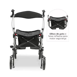 -Auxilia em alterações de equilíbrio e de locomoção, oferecendo apoio e suporte ao usuário; -Dobrável, desmontável e fácil de montar; -Possui suporte de bengala ou guarda-chuva; -Altura ajustável em 7 níveis com pino click; -Bolsa porta-objetos com capacidade de até 5 kg; -Freios individuais nas rodas traseiras; -Segurança: com faixa reflexiva, olho de gato e freios de serviço e de estacionamento; -Mais conforto: assento acolchoado e manoplas ergonômicas; -Rodas silenciosas que aumentam o conforto no andar.