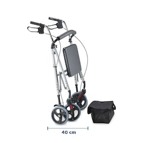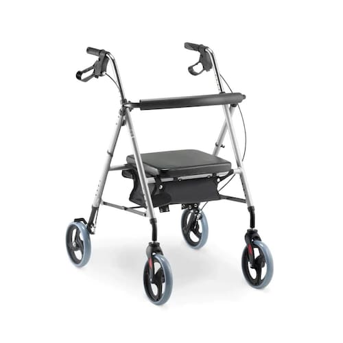 -Dobrável, desmontável e com montagem simples; -Altura ajustável para atender usuários entre 1,55 m a 1,85 m; -Auxilia em alterações de equilíbrio e de locomoção, oferecendo apoio e suporte ao usuário; -Freios na manopla, ativos em movimento ou travado quando sentado; -Apoios de mão emborrachado, macio e anatômico, de fácil limpeza ou substituição; -Assento lavável de esponja de alta densidade revestido em PVC; -Cesto de tecido sintético para guardar objetos (localizado embaixo do assento); -Freios individuais nas rodas traseiras e freio de estacionamento; -Faixas reflexivas para maior segurança.