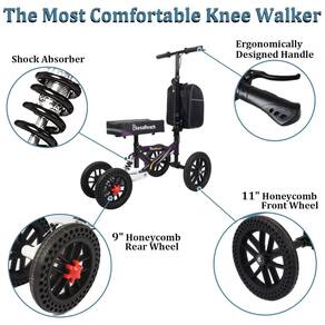 All Terrain Knee ScooterEstes andadores de scooter de joelho fáceis de manobrar apresentam duas rodas dianteiras de 28 centímetros e duas rodas traseiras de 23 centímetros, sem necessidade de inflar e à prova de explosão, reduz o problema de inflar pneus pneumáticos e é mais estável e mais macio do que outras rodas puv para scooter de joelho. Funciona bem em todos os terrenos, incluindo grama, cascalho, terra e fendas nas calçadas.