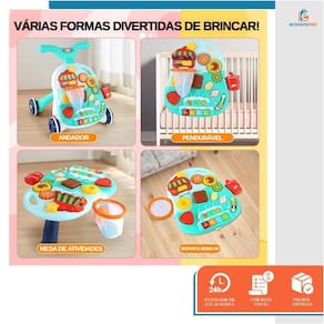 Andador de bebê 2 em 1: O andador de aprendizado de sentar a ficar em pé incentiva os primeiros passos do bebê, desenvolvendo coordenação e força ao empurrar o andador para frente, aprendendo a ficar em pé e caminhar inicialmente.Centro de Atividades Musical: Este andador de bebê oferece um centro de atividades para os bebês, incluindo blocos em formato de animais, engrenagens giratórias, um piano musical e muito mais, proporcionando várias formas divertidas de brincar.Projetado para Bebês: A alça do andador pode ser ajustada de acordo com a altura do bebê. Além disso, ele pode ganhar peso através da injeção de areia ou outros objetos pesados, garantindo que o bebê ande com mais estabilidade.Alta Qualidade e Segurança - Ambos os pneus são revestidos com anéis de borracha antiderrapante, a estrutura triangular suporta o chassi, evitando que o andador vire facilmente. A velocidade das rodas traseiras é ajustável, atendendo às necessidades dos bebês em diferentes estágios de caminhada.Características:Feito de materiais de alta qualidade e não tóxicosEstrutura triangular estável torna o item mais seguroDuas opções de ajuste de velocidade, adaptáveis à velocidade de caminhada do bebêA alça pode ser ajustada de acordo com a altura do bebêDesign de injeção de água, caminhada mais estávelEspecificações técnicas:Material: PlásticoDimensões: 41cm altura x 35cm largura x 40cm comprimento Necessita de 3 pilhas AA não incluídas Idade recomendável: 6+ mesesMarca: Baby StyleHomologação Inmetro: 3952/2018-BRI-23