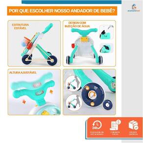 Características: Feito de materiais de alta qualidade e não tóxicos Estrutura triangular estável torna o item mais seguro Duas opções de ajuste de velocidade, adaptáveis à velocidade de caminhada do bebê A alça pode ser ajustada de acordo com a altura do bebê Design de injeção de água, caminhada mais estável