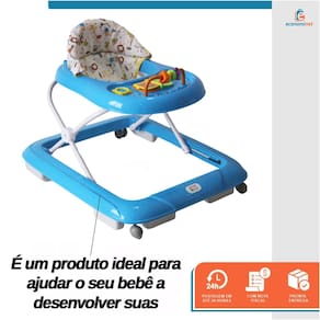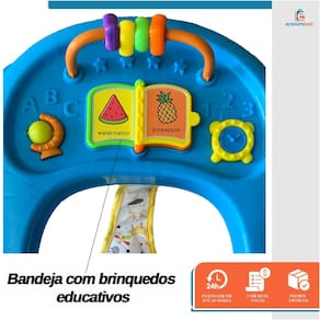 Características: Estrutura em plástico resistente Assento confortável e acolchoado Bandeja com brinquedos que produzem som e luzes Rodas com freios para maior segurança 3 alturas ajustáveis para acompanhar o crescimento do bebê Dobrável e compacto para fácil armazenamento
