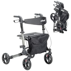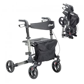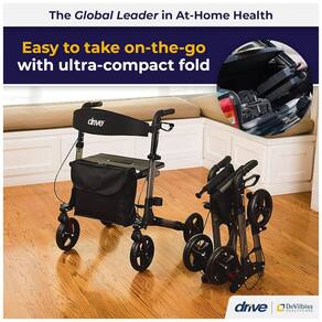 O Andador Dobrável Compacto da Drive Medical é fabricado em alumínio leve e resistente, com estrutura de 4 rodas de 20 cm de diâmetro para navegação em superfícies internas e externas variadas. O sistema de dobragem permite redução para dimensões compactas, facilitando armazenamento e transporte em espaços reduzidos. Os punhos ajustáveis oferecem personalização de altura para adaptação ergonômica ao usuário.