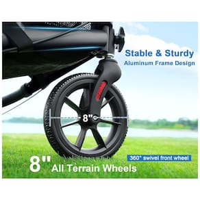 Rodas de 20 cm Adequadas para Todos os Terrenos: A roda dianteira giratória flexível de 360° pode ser usada em vários espaços, como portas, saguões, ruas, lojas, elevadores, etc. O padrão de piso antiderrapante nas rodas pode fornecer maior aderência ao solo para evitar que seu andador escorregue ao caminhar, as rodas de 20 cm são adequadas para a maioria dos terrenos.