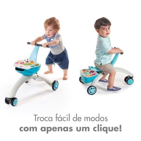 5 funções: brincar, caminhar, empurrar, ficar em pé e sentar Painel eletrônico removível para brincar em qualquer lugar Cesto para levar objetos preferidos do bebê Controle de velocidade para os primeiros passos Rodas revestidas em material macio Fácil alternar entre as funções com apenas um clique Atua no desenvolvimento cognitivo e motor Utiliza 3 pilhas AAA (não incluídas)
