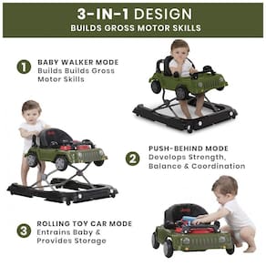 A altura do assento ajustável permite que o andador cresça com seu filho. O design 3 em 1 converte do modo andador de bebê para o modo push behind é um modo de carro de brinquedo rolante com zenamento de brinquedos Assemelha se ao clássico Wrangler com sua grade de sete slots, faróis redondos e pára lamas planos A bandeja de brinquedos possui volante que gira da esquerda para a direita e emite sons realistas de buzina e motor, piscas acendem, remova a bandeja de brinquedos para revelar uma bandeja de lanches O encosto alto proporciona conforto e máximo suporte Almofada do assento limpa facilmente Dimensões montadas 73 x 63 x Marca: Não Informado