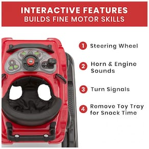 A altura do assento ajustável permite que o andador cresça com seu filho. O design 3 em 1 converte do modo andador de bebê para o modo push behind é um modo de carro de brinquedo rolante com zenamento de brinquedos Assemelha se ao clássico Wrangler com sua grade de sete slots, faróis redondos e pára lamas planos A bandeja de brinquedos possui volante que gira da esquerda para a direita e emite sons realistas de buzina e motor, piscas acendem, remova a bandeja de brinquedos para revelar uma bandeja de lanches O encosto alto proporciona conforto e máximo suporte Almofada do assento limpa facilmente Dimensões montadas 73 x 63 x Uso recomendado Para crianças de até 25 quilos. menos de 30 polegadas de altura Conforto duradouro o encosto alto proporciona conforto e suporte máximo Marca: Não Informado