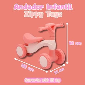 O primeiro passinho rumo à autonomia começa com segurança, conforto e alegria O Andador Infantil Baby da Zippy Toys é ideal para bebês a partir de 1 ano que estão aprendendo a se equilibrar e explorar o mundo. Com design sem pedais, estrutura robusta e 4 rodas que garantem maior estabilidade, o andador funciona como uma bicicleta de equilíbrio, promovendo desenvolvimento motor e autoconfiança.