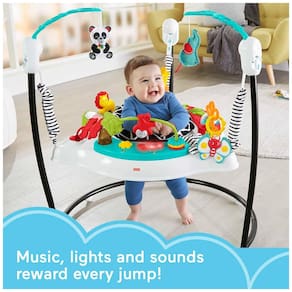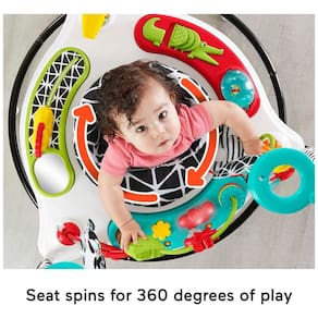Jumper infantil autônomo com um assento que gira 360 graus para brincar. Música, luzes e sons recompensam e encorajam cada salto do seu bebê Ajusta se facilmente a 3 alturas diferentes à medida que o bebé cresce Os brinquedos coloridos incluem um camaleão iluminado, panda e elefante morcego, controle deslizante de leão, nadadeira de crocodilo, mordedor de sapo, girafa de contas e muito mais. Além disso, 2 brinquedos para levar. Almofada de assento removível e lavável à máquina Marca: Não Informado