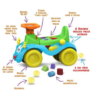 Os andadores para bebês são a fase intermediária entre o carrinho de bebê e o inicio do engatinhar. Trata-se de uma estrutura que permite aos nossos filhos andar de forma assistida. A Totokinha Bolinha da Cardoso Toys é um um brinquedo que auxilia os primeiros passos do bebê de forma lúdica e divertida! Vem com formas geométricas para encaixar no banco, e um grande diferencial: A Totokinha Bolinha tem um escorregador de bolinhas nas laterais! O bebê coloca a bolinha na lateral, ela escorrega, passa por baixo do assento e sai pelo escapamento! É muito legal! Na carinha desse carrinho andador as mãozinhas vão para frente e para trás, com um barulhinho de ?crec crec?, e a língua também pode ser deslocada para os lados. Este brinquedo desenvolve a coordenação motora, o raciocínio lógico, imaginação, senso de direção, lateralidade, senso de organização e muito mais! Idade recomendada de 01 a 02 Anos Aprovado pelo INMETRO Certificação do INMETRO CE-BRI/INNAC - 08116-21/2020 Capacidade Peso máximo suportado 40kg