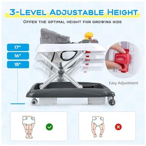Ajuste de Altura em 3 Níveis: O andador para meninos e meninas possui 3 níveis de ajuste de altura do assento para acompanhar o crescimento do bebê e seu desenvolvimento nas diferentes fases da caminhada. É fácil ajustar o assento para a posição apropriada com base na altura do bebê, prevenindo cientificamente as pernas arqueadas.