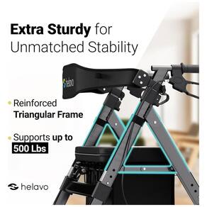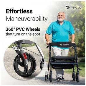 Extra Forte e Largo: O andador pesado Helavo é projetado com uma estrutura de alumínio reforçado, garantindo excepcional durabilidade e uma capacidade de carga de até 227 kg. Seu espaçamento largo das alças de 57 cm proporciona um assento generoso e confortável, ideal para pausas.