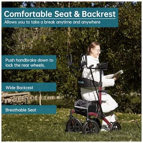 Assento Confortável com Encosto: O assento largo com encosto de malha respirável, combinado com as rodas traseiras traváveis, garante conforto e segurança durante as pausas.