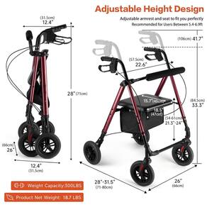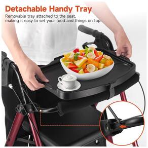 Design Leve para Facilitar o Transporte: O andador rollator Ambliss com assento pesa apenas 8 quilos. Seu mecanismo de dobragem com um toque permite que ele seja dobrado em segundos, garantindo um transporte sem esforço tanto para viagens quanto para uso diário. Nosso andador rollator de 4 rodas foi projetado com uma estrutura reforçada e barras de apoio duplas, capaz de suportar até 136 kg. A espessura do tubo e a construção robusta das paredes garantem durabilidade e estabilidade a cada passo. O assento acolchoado proporciona conforto prolongado durante os períodos de assento. Assento e Manoplas Ajustáveis: O andador rollator para idosos possui altura de assento ajustável de 54 cm a 61 cm e altura de manopla ajustável de 84,5 cm a 106 cm, permitindo que idosos personalizem sua postura e conforto para atender às suas necessidades individuais. Segurança Reforçada com Rodas de 8 Polegadas: Com rodas de 8 polegadas resistentes a furos, o andador dobrável oferece manobrabilidade de 360 graus, estabilidade aprimorada e absorção de choque superior em superfícies irregulares. Os freios traseiros traváveis impedem rolamentos acidentais durante transições de sentado para em pé, aumentando a segurança geral. Bandeja Removível e Cesta de Armazenamento: O andador com assento inclui uma bandeja removível, facilitando o posicionamento de alimentos e itens pessoais. Além disso, a cesta de armazenamento reforçada permite que os usuários carreguem itens essenciais, como mantimentos ou suprimentos médicos, de forma conveniente.