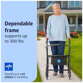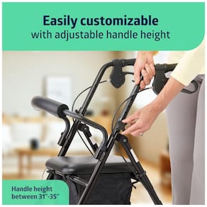 Descubra o andador rollator de alumínio da Medline, confiado por profissionais de saúde e hospitais em todo o mundo, agora disponível para proporcionar o suporte perfeito para idosos, adultos, pessoas idosas e aqueles com mobilidade reduzida. Com assento e encosto acolchoados em preto, este rollator possui 6 rodas de 15 cm para se deslocar suavemente de ambientes internos para externos. Além disso, conta com assento acolchoado preto de 30x30 cm, pesa apenas 6,3 kg, suporta até 136 kg e possui estrutura em alumínio preto. Ideal para adultos e idosos com mobilidade limitada, proporcionando segurança e conforto. Com amplo espaço de armazenamento sob o assento, este rollator transporta você e seus pertences com segurança e conveniência. As manoplas ergonômicas facilitam o acionamento dos freios - basta apertar para frear e empurrar para travar as rodas. Ajuste a altura das manoplas de 79 a 89 cm para um ajuste perfeito. Além disso, sua estrutura dobrável permite transporte e armazenamento práticos. Ande suavemente, dentro ou fora de casa, com as 6 rodas projetadas para fácil locomoção em qualquer terreno.
