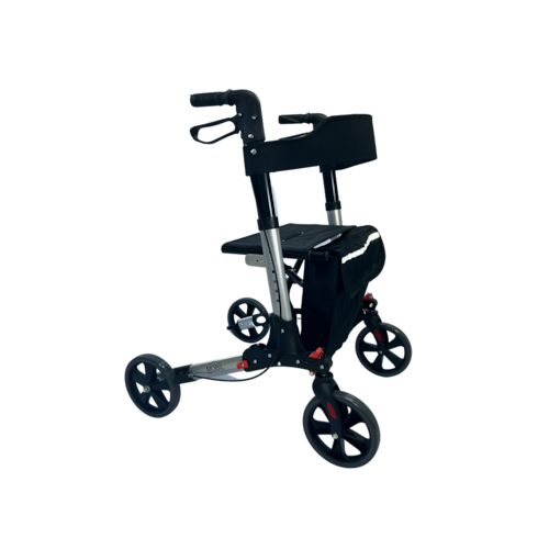 • Capacidade de peso: 130kgs • Confeccionado em alumínio • Pintura Eletrostatica Anodizado (Prata) • Encosto em lona • Totalmente dobrável (Economia de espaço) • Freios na manopla • Bolso removível para guardar pertences • Suporte para bengalas e guarda chuva • Assento em lona • 4 Rodas 8” em PVC • Regulagem de altura do Manete de freio • Ideal para pessoas até 1,85m