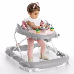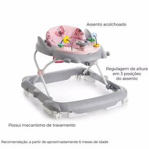 Para o divertimento da criança, o andador acompanha bandeja brinquedo. Sua composição têxtil é 100% poliéster.