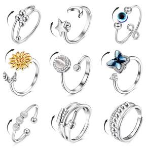 1 - Anéis para ansiedade – você receberá 9 peças de anéis de ansiedade fidget com diferentes estilos, incluindo anel fidget de girassol, anel fidget de zircônia cúbica, anel fidget de borboleta, anel fidget de olho turco, anel fidget de estrela da lua e anel fidget de contas. Formas fofas e designs interessantes trazem uma variedade de opções para usar todos os dias - Anéis de ansiedade para aliviar o desconforto – O anel fidget exclusivo é rotativo, pode girar manualmente muito suavemente e continuar por um bom tempo sem fazer barulho, ajuda você a superar o desconforto e reduzir a ansiedade. Perfeito para alguém que está procurando uma maneira sem distração de redirecionar maus hábitos ou obter energia inquieta quando, de outra forma, você não consegue - Material de latão e tamanho ajustável: estes anéis fidget são feitos de latão de alta qualidade, leves e duráveis, não desbotam ou enferrujam. Embutido com zircônia cúbica AAA+ brilhante, mais deslumbrante e atraente. Design aberto que é muito fácil de ajustar para um ajuste confortável, adequado para a maioria de vocês - Anéis de ansiedade fidget para mulheres – o conjunto de anéis de ansiedade fidget é popular entre todas as idades, adequado para sua esposa, namorada, mãe, filha, família e amigas no aniversário, dia das mães, aniversário, feriados, formatura, Natal, Dia dos Namorados e muitos outros dias especiais - Por que nos escolher: FIBO STEEL é uma marca de joias com uma equipe de design e uma fábrica experiente. Fabricamos apenas alta qualidade, atenção aos detalhes