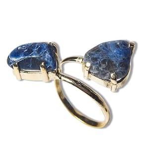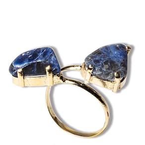 Anel 2 Pedras Sodalita Rolada Natural Aro Ajustável Dourado, Anel aro ajustável com banho dourado montado com 2 pedras Sodalita roladas. Beleza e cura natural em uma única peça. Sodalita é uma pedra que pode produzir fortes mudanças em sua atitude, ela o ajuda a ser mais objetivo e menos crítico a cerca do modo como lidar com a existência e a desvencilharse das armadilhas provocadas por um estilo de vida complicado.