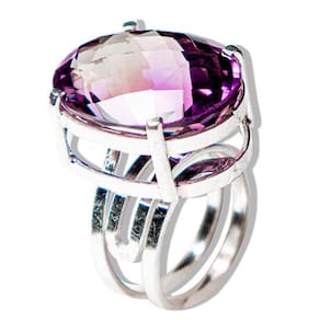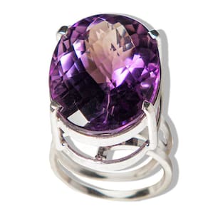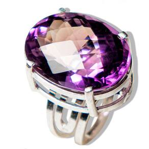 Anel de Prata 950 com Pedra Ametista Super Extra Natural Descubra a elegância atemporal do nosso Anel de Prata 950 com Pedra Ametista Super Extra Natural. Este anel é uma peça exclusiva, projetada para realçar sua beleza única, feito manualmente com cuidado e atenção aos detalhes. Detalhes do Produto:\nNome da Pedra: Ametista Super Extra Cor da Pedra: Roxo vibrante (foto autêntica) Lapidação: Gema em formato de cabochão facetado, que reflete a luz de forma deslumbrante Medidas da Pedra: 22 x 16mm Medida do Aro: Ajuste para qualquer dedo, garantindo conforto e praticidade Peso Total da Joia: 50ct\nMaterial:\nMetal: Prata 950, conhecida por sua qualidade superior e durabilidade\nCaracterísticas da Pedra: A Ametista é um mineral autêntico de garimpo brasileiro, valorizada por suas propriedades espirituais e estéticas. Cada pedra é única e pode apresentar variações de tonalidade e grafismos, além de pequenas inclusões que são características normais de gemas naturais. Recomendamos a hidratação com óleo mineral para preservar sua beleza. Por que Escolher Este Anel?\nDesign Exclusivo: Cada peça é lapidada manualmente, garantindo um toque pessoal e artesanal. Versatilidade: Ideal para qualquer ocasião, seja para o dia a dia ou eventos especiais. Presente Perfeito: Surpreenda alguém especial ou presenteie-se com esta joia marcante. Marca: CristaisdeCurvelo