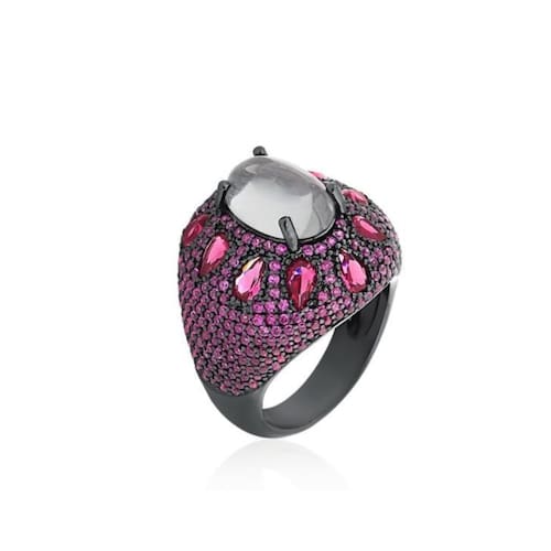 Anel Cabochão Fumê Folheado a Ródio Negro com Zircônias Rosas. Anel Feminino robusto e chic com Micro Cravação em Zircônia Roxa. Design diferenciado, arrase