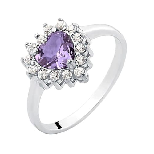Detalhes: Pedra Zircônia roxa em formato de coração de 6MM e 14 pedras Zircônias translúcidas em sua volta de 1MM