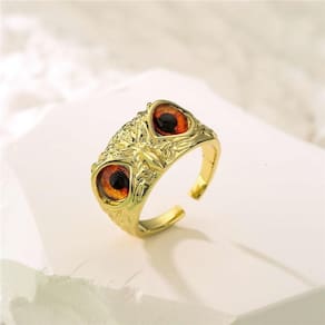Anel dourado banhado a ouro 18k coruja olho laranja ajustável Anel ajustável coruja com olhos realistas azuis. Perfeito para todas as ocasiões, inclusive para presentear, já que não precisa saber exatamente o tamanho pra comprar. Por ser ajustável cabe perfeitamente em qualquer circunferência anelar. Bela peça, acessório imponente, com fino acabamento e belíssimos olhos azuis realistas. Acompanha saquinho de veludo símbolo da inteligência e da sabedoria, a coruja tem significados que combinam com quem busca crescer e ver além, alcançando vôos mais altos. Ela tem a capacidade de enxergar através da escuridão da noite e também simboliza a reflexão e o conhecimento racional e intuitivo. Na mitologia grega, athena, a deusa da sabedoria, tinha a coruja como símbolo, assim como minerva, na mitologia romana. Marca: Pjk store