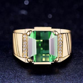 Anel Dourado Banhado Pedra Verde e Zircônias Ajustável Lindo Anel Ajustável. Perfeito para todas as ocasiões, inclusive para presentear, já que não precisa saber exatamente o tamanho pra comprar. Por ser ajustável cabe perfeitamente em qualquer circunferência anelar. Bela peça com pedra lapidada, acessório imponente, com fino acabamento em zircônias cravejadas. Largura de superfície: 12mm Peso líquido: cerca de 7,2g